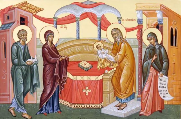 Acest Simeon, în urma cu 300 de ani tradusese din Isaia Proorocul profeția: “Iată Fecioara va lua în pantece și va naște fiu”, Is. 7-14 și neînțelegînd cum fecioara va naște fiu, a înlocuit cuvântul Fecioara cu femeia, considerând o greșeală a profetului Isaia. A doua zi a venit îngerul și a înlocuit femeia cu fecioara din traducere și bătrânul nedumerit iarăși înlocuiește fecioara cu femeia. Atunci i se arată îngerul Gabriel și îi spune ca: ” Nu va muri până când nu va vedea această profeție implinindu-se că Fecioara va naște un Fiu și va rămâne Fecioara”. Acum rostește această rugaciune:”Acum eliberează pe robul Tau Stapane, după cuvântul Tau în pace că văzură ochii mei mântuirea Ta. Lumina spre descoperirea neamurilor și slava poporului Israel” arătând rolul Mântuitorului Hristos de a lumina popoarele cu Evanghelia învățăturii Lui. După închinarea la Templu Iosif cu Maria și Iisus vor fugi în Egipt de frică lui Irod care a fost înștiințat de fariseii aflați la Templu.